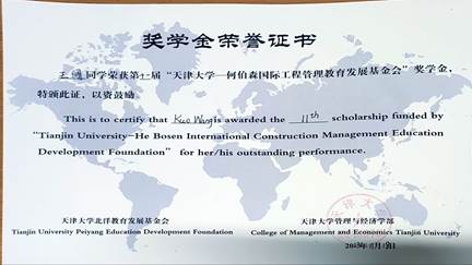 2023年11月18日上午,第十一届“天津大学—何伯森国际工程管理教育发展基金”奖学金评定会暨颁奖仪式在天津大学第26教学楼A座409室隆重举行。我校20级本科生王阔同学是本届的七位外校获奖者之一。