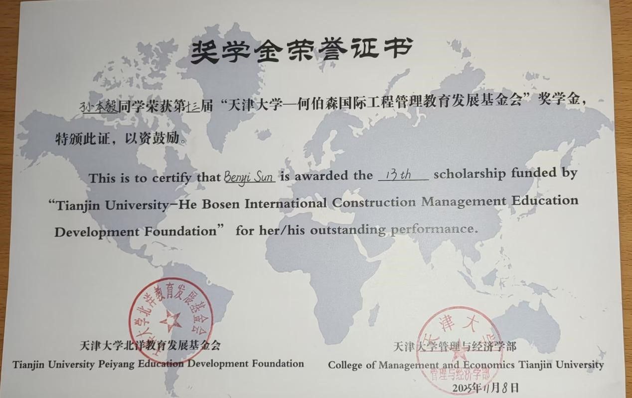 2025118日上午,第十三届天津大学何伯森国际工程管理教育发展基金奖学金评定会暨颁奖仪式于天津大学26A209室隆重举行。我系22级本科生孙本毅同学是本届的七位外校获奖者之一。